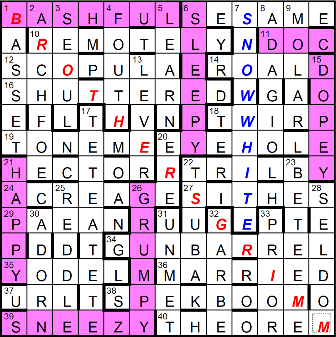 Cosy old pew (7) COSY OLD PEW DOPEY SLOW C – answer and letter transferred to 15 down Entry is BASHFUL and letter is T, transferred from 21 down |