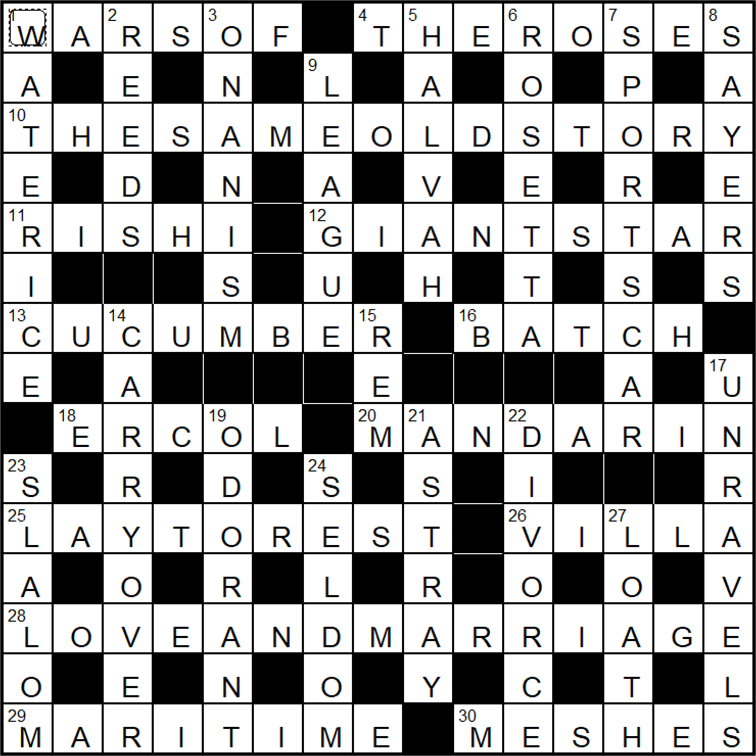Thanks both. Very entertaining, and not without its challenges, notably GIANT STAR wherein one definition feels very general, and the other was GK beyond my reach, alongside WARS OF THE ROSES, familiar of course to me as a Lancastrian although the Shakespeare angle was unknown. The theme is as contemporary as you can achieve, and I am happy to at least have spotted the actors’ names, whilst being singularly unaware of anything on at the cinema for far too long now, until it reaches the small screen.