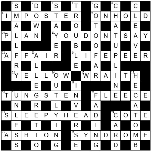 I guess it was one of those same wavelength days and it’s always a boost when the first across clue goes straight in. I liked TUNGSTEN, WRAITH and SLEEPYHEAD, which was my last one parsed.