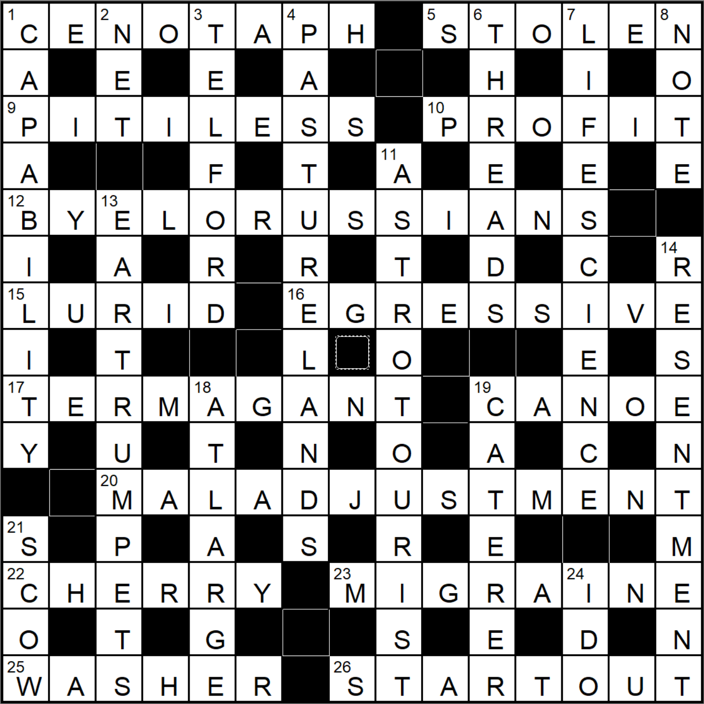 I saw that BELORUSSIAN almost fit early on, but dismissed it since I’d never seen it spelled with a Y, which slowed me down for a while.
