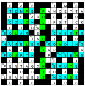 Well, wonders will never cease. I didn’t parse SOLAR (thanks Pierre) or PANCETTA (thanks KVa) but otherwise I didn’t find this too bad for a Nimrod and I finished it in (for me) a reasonable time, which for most here I suspect would be unimaginably slow. I’m sure the “generous” grid helped as Pierre says and I doubt we’ll be as fortunate whenever and wherever JH turns up next time. Favourite bit was the ‘this is his’ wordplay.