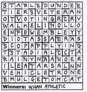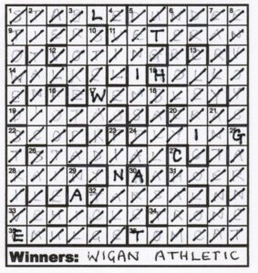 And we were told in the very clear preamble that we had to ‘eliminate’ the members of the 15 losing teams. So we had to erase all 131 letters from those 15 clubs and we were left with WIGAN ATHLETIC*. (Is this Harribobs promoting his local team? I have a famous ‘Uncle Tom’ who belonged to Preston North End – far more significant, I believe!)