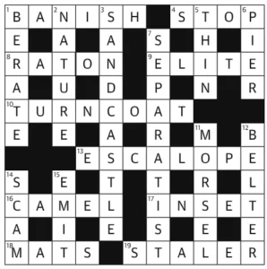 Parsinganagram of (ACE POLE’S)* with an anagrind of “cooked” for a thin slice or beaten out slice of meat that comes under a number of spellings, this version borrowed from the French and the way Wiener Schnitzel is prepared. It’s one of the ways I’ve eaten rabbit. |