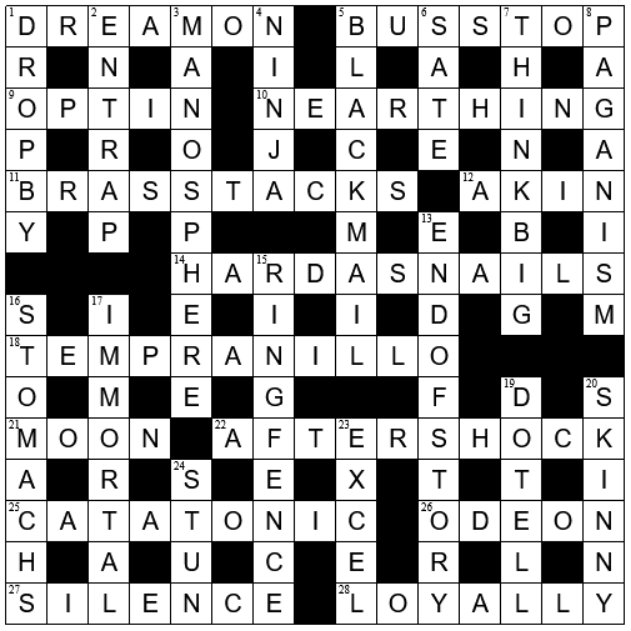 A fairly typical Anto puzzle, some good clues and some clunkers. LOYALLY simply doesn’t work. BRASS TACKS, on the other hand, was excellent.