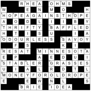 Hidden in oveRHEAd. And a belated Obligatory Pierre Bird Link. The rhea is a South American species, distantly related to the African ostrich and the Australian emu. It’s also known as a nandu, which comes from ñandú guazu in Tupi, meaning ‘big spider’. And of course its main characteristic, shared with its African and Australian cousins and alluded to in the clue, is that it is flightless.