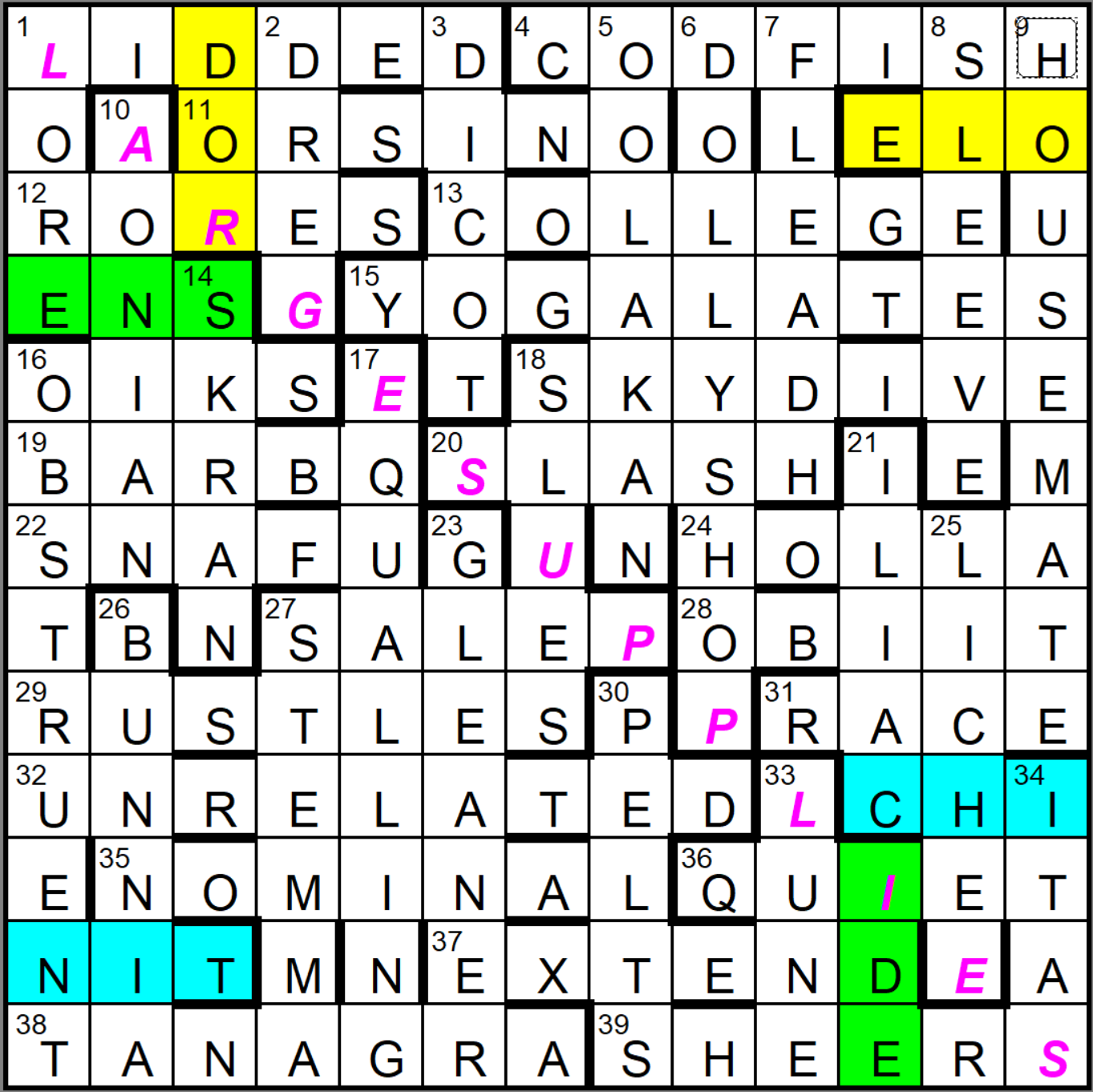 I enjoyed this throughout, with the theme and all its parts running through the clues, the grid and the endgame. I didn’t know the ‘humorous quatrain’ by Ronald Knox, so that was a bonus, and there were a few tricky surprises in the clues: I liked ‘D-Reg’ in the wordplay to 2d, also ‘snafu’ (22a) and ‘bar-B-Q’ (19a), the last of which I did not realise was a word in the dictionary.
