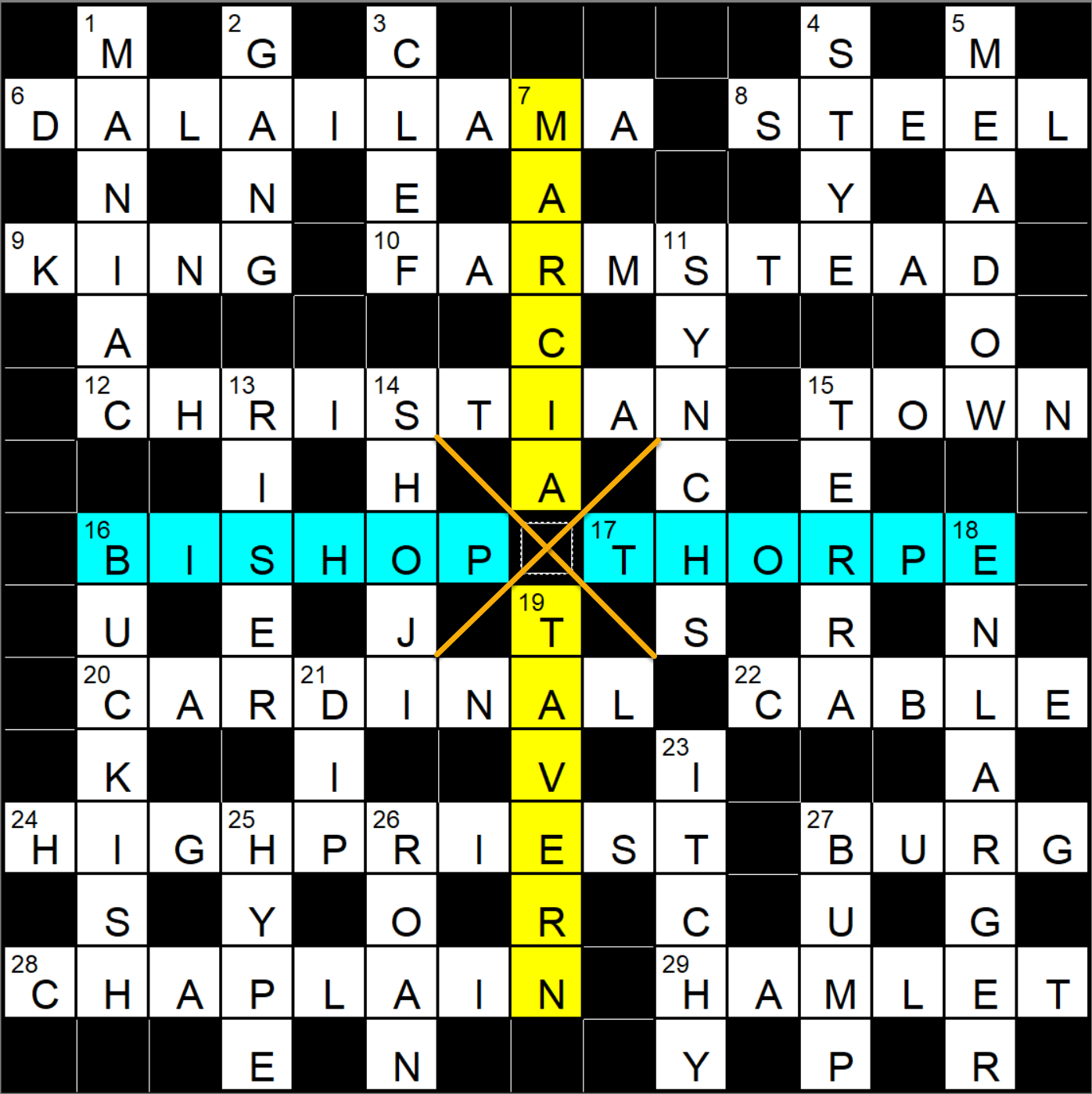 I could see a potential theme appearing in the left half of the puzzle where we had many religious references – clerics of various faiths, a follower of one faith and a King. I could also see another potential theme on the right side of the grid where we had dwellings and communities of various sizes. Of course, neither represented the correct theme.