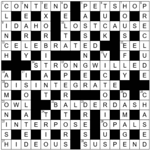Nice puzzle! DRESS held me up for longer than I would have expected, but getting it unlocked the rest of the SE corner to finish the puzzle. I needed the blog for WILLED = left 🙊. LOI was OPALS.