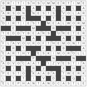 | Two versions when the seven words are resolved one way or the other – either BRITISH SUMMER TIME for the Saturday solution or GREENWICH MEAN TIME for the Sunday version. This gives the Saturday version, with the Sunday in the text. | ||