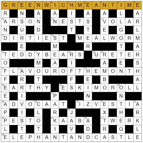 I found some of the vocabulary here unfamiliar, ending up blogging it with the crib sheet and Chambers next to me. I solved a good chunk without cheating, particularly the bottom two thirds and had half seen how the top section worked (is it this or that) but not enough to fully solve the unclued top line and seven double-definitions-with-a-letter-change trick, but ran out of time to finish it and get it blogged in time for the weekend. I need to start doing the Genius/AZED/Gemelo puzzles.