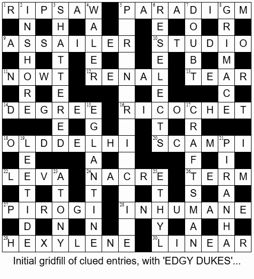 It was only when writing up the blog that I realised I hadn’t fully parsed 10A STUDIO, and worked out that the extra letter was Y, giving EDGY DUKES, who fill the edges of the grid: