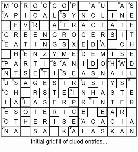 In this case, it soon became clear that the eight unclueds were a set of rotationally symmetrically placed 4- and 6-letter slots, with one ‘unch’ (unchecked letter) for the 4s, and two for the 6s.