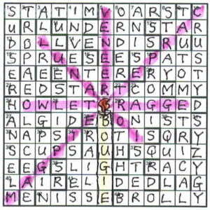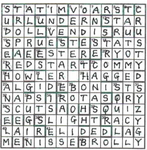 With the gird filled, we needed to have identified almost all of the extras to piece out two clues from the series of first and last letters, and they were indeed ‘cryptic’ clues. MARCHES COULD BE PASSING NEW LIGHT AIRCRAFT. That was a real head-scratcher until we twigged that the ‘Marches’ could be MONTHS and if we ‘passed’ or removed N(ew) we were left with MOTHS (was his light aircraft a HAWK MOTH – the source of the idea?)