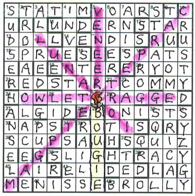 With the gird filled, we needed to have identified almost all of the extras to piece out two clues from the series of first and last letters, and they were indeed ‘cryptic’ clues. MARCHES COULD BE PASSING NEW LIGHT AIRCRAFT. That was a real head-scratcher until we twigged that the ‘Marches’ could be MONTHS and if we ‘passed’ or removed N(ew) we were left with MOTHS (was his light aircraft a HAWK MOTH – the source of the idea?)