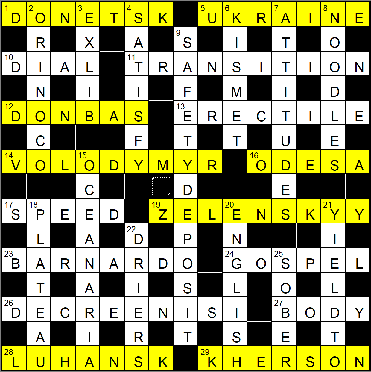 This puzzle may have been a bit more difficult a few years ago when the Ukrtnian locations were less well known.. Unfortunately nowadays, many of the cities and regions are mentioned in the media daily.