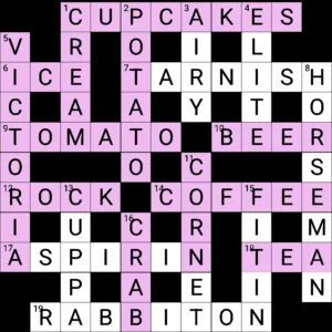 I have highlighted the clues. I’ve added TOMATO (which I hadn’t heard of) + BEER and CORN , which I vaguely knew, to the more obvious CREAM, VICTORIA and etc cakes I haven’t highlighted ICE but could have as part of an ICE CREAM CAKE. (My daughter hates ice cream cakes. She got one for her August birthday one year and was most unimpressed.) I also thought AIRY refers to FAIRY cakes, but not actually in the clues.