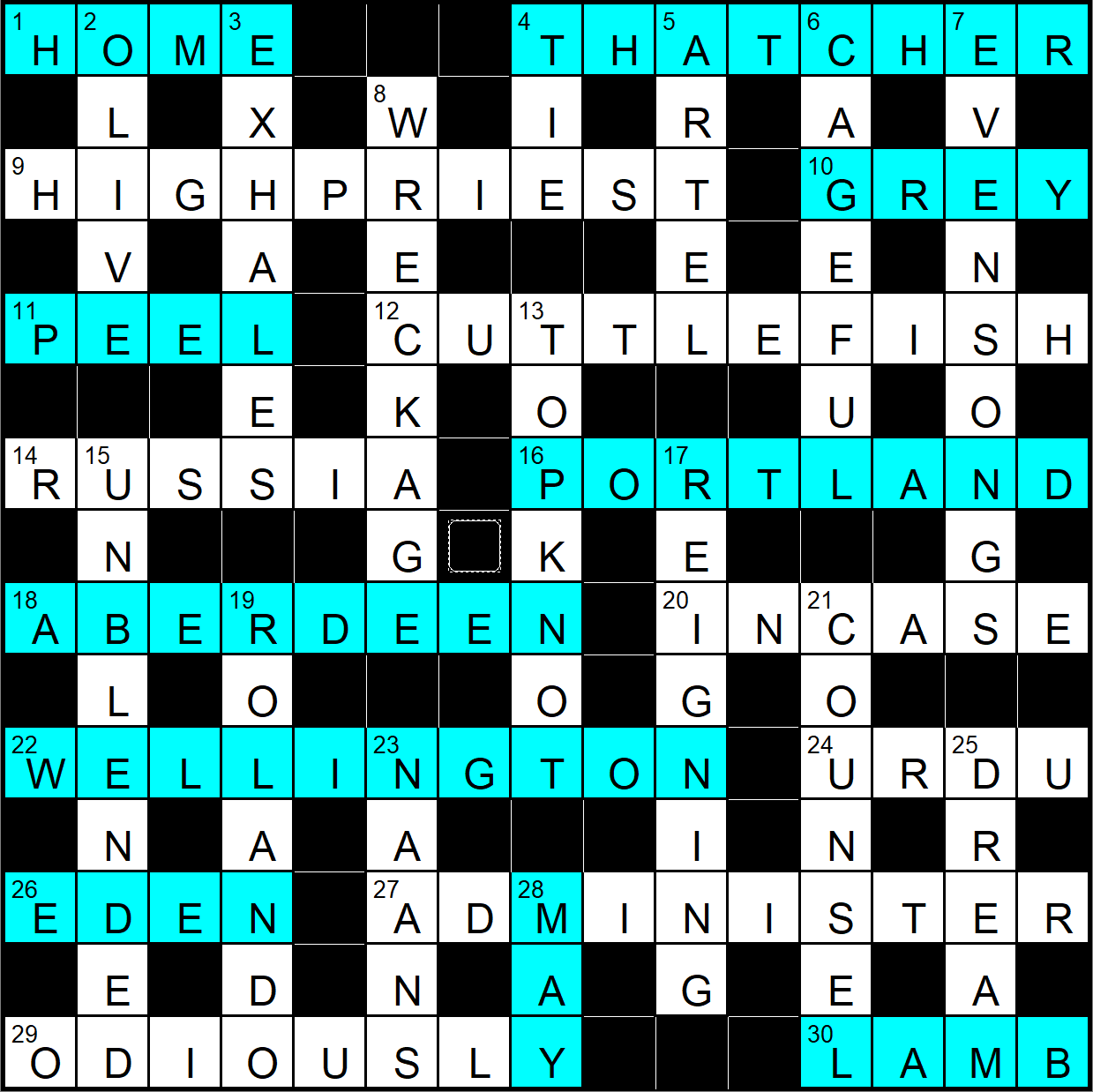Tuesday is theme day in the Independent. Today we have a number of UK Prime Ministers in the grid, almost all in the Across entries. I recognised most of the names but had to do a bit of research to pick up Lord PORTLAND and Viscount Melbourne (William LAMB). There is also a reference in the clues to Tony BLAIR [born 1953], Prime Minister from 2/5/1997 to 27/6/2007.