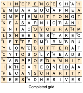 As we completed most of the east side of the grid fairly early on, we realised that the extra letters in the last six clues spelt BREWER, and Joyce discovered that Kruger had used the ‘Brewer Dictionary of Phrase and Fable’ in a previous puzzle, and with some electronic help found the phrase ‘GENEROUS as HATIM’ which fitted with HA-I- at 9d. We had never heard this phrase before, but we realised that we could reverse-solve the clue for 9d to get ‘generous’. As we progressed we figured out that the ‘useful information’ provided by the letters from the extra words could read: ‘THEMATIC ENTRIES CAN EACH BE VERIFIED UNDER ‘AS’ IN BREWER’. Unfortunately the online Brewer Dictionary site that we had found did not recognise ‘as’ as a search word, but some of the phrases were familiar (eg ‘soft as butter’, ‘cheap as chips’, ‘near as damn it’), some we guessed and then checked (eg ‘right as ninepence’, ‘dead as mutton’) but luckily we eventually stumbled on a site that provided a list of phrases including ‘as’, which enabled us to confirm ‘game as Ned Kelly’ at 1d and ‘smart as paint’ at 13d.
