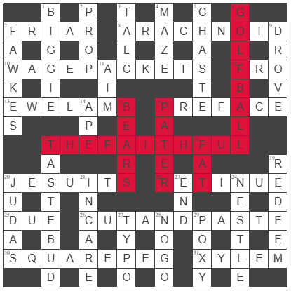 The rubric goes on:  Five further clues are ambiguous.   One of these is 17 across which centres the whole structure; the other four are the down clues which do not lose a letter or are not 7 and 20 – these are 6, 15, 16 and 18, whose alternative answers offer the alternative “sides”.  And four more (clues) are undefined:   these are 7 and 20 across and down, the examples of traitors and faithful.