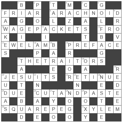 The instructions tell us Entrants must pick a side.  This suggests the alternative entries for 17 across, the central light.  This is defined as game show contestants and may be entered as THE TRAITORS or THE FAITHFUL – the two sides in the BBC game show.  The whole clue reads:  7 and 20 could be games show contestants and 7 and 20 down solve as FAWKES and JUDAS (traitors) and 7 and 20 across as FRIAR and JESUITS (faithful).