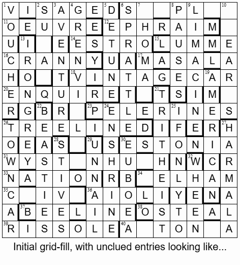 Anyway, the first PDM was that 7D looked like THOMAS, and 10D could be STEARNS, and even my threadbare literary knowledge includes T(homas) S(tearns) Eliot’s first and middle names. C(live) S(taples) Lewis and A(ntonia) S(usan) Byatt followed, then P(elham) G(renville) Wodehouse…with W(ystan) H(ugh) Auden last (after a little e-research!)