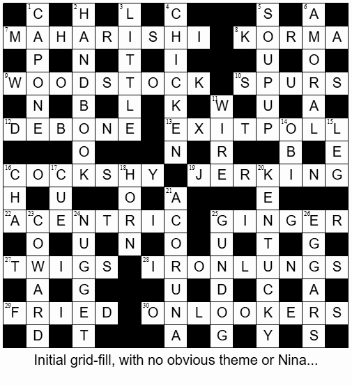 I solved and submitted this last weekend, quite blithely ignorant of any sort of linkage or theme, and it was only when I started to write up the blog and create a grid that I saw – in plain sight – KENTUCKY, FRIED and CHICKEN! Then JERK, KORMA and NUGGET…WOODSTOCK, DEBONE, SOUP…gahhh…how could I have missed all that?!