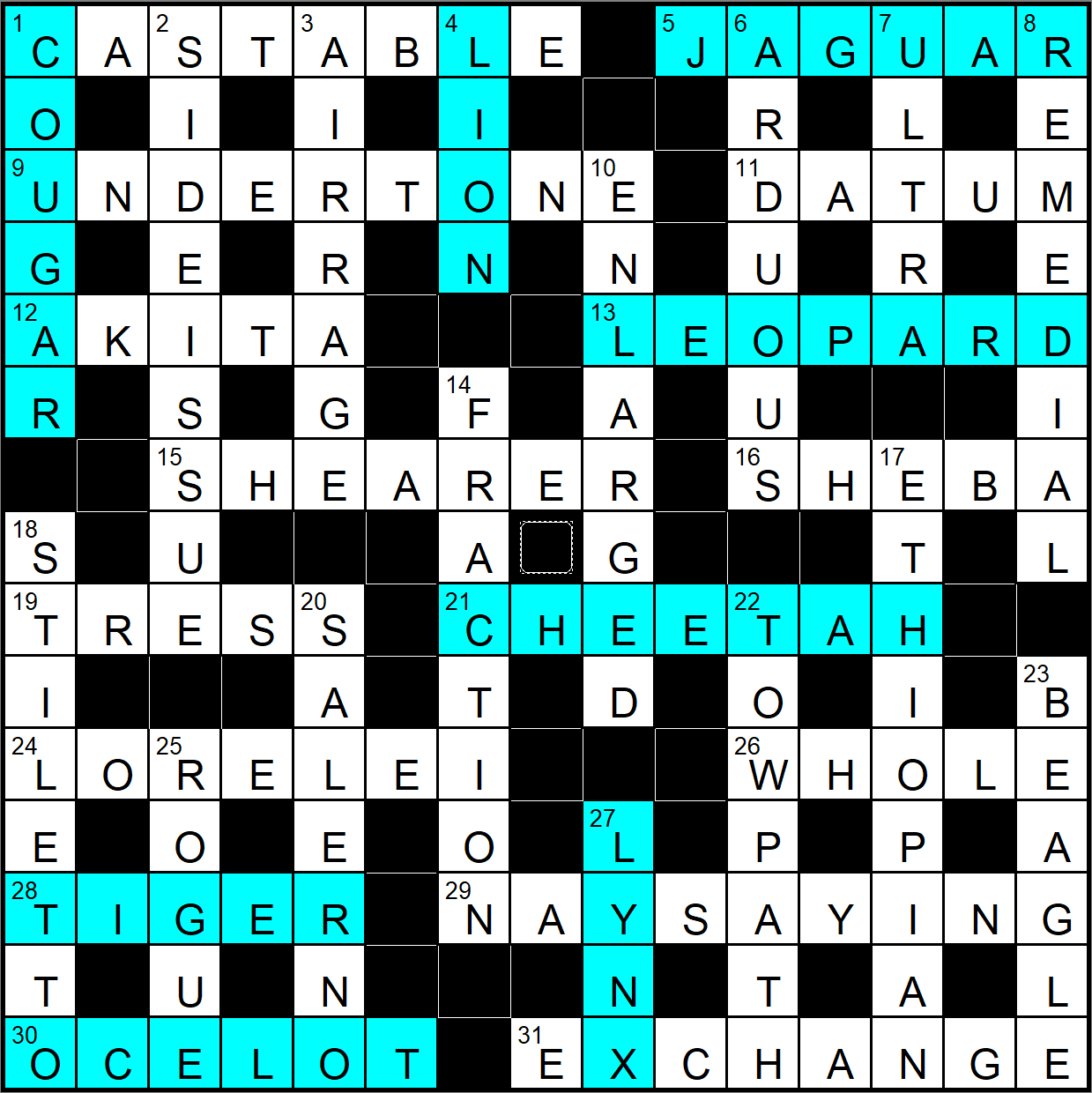 Tuesday is theme day in the Independent. Today’s theme was fairly clear. We have several big cats in the grid. There are also a couple of dogs – AKIBA and BEAGLE, but that’s not enough to form another theme.
