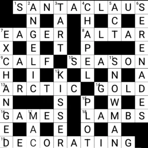 The puzzle for this week is the 7th Quick Cryptic by Dice. Dice only sets Quick Cryptic puzzles for the Guardian. Today we have anagrams, hidden and acrostic, plus middle letter clues with all the letters given, which should be accessible. We are seeing middle letter clues for the second time, last seen in Dice’s puzzle #61 (but I have seen that clue in the last few days in the Guardian). There is a seasonal theme – a late addition to the conversation on Dice’s last puzzle was someone pointing out that all Dice puzzles have a theme, and I did go back to check, but didn’t write it down anywhere.