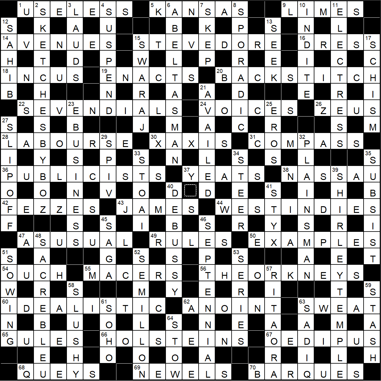 I maintained a record of which beginning or ending letters I found whilst solving. This helped at the end, especially when dealing with X and Y in the thematic Across entries. 30 across could be solved as both X-AXIS and Y-AXIS. The ambiguity was resolved by realising the poet at 37 across had to be YEATS rather than KEATS as we already had KANSAS for the K