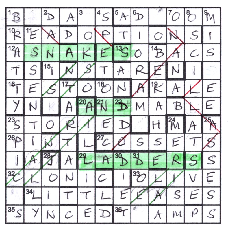 With all solved and all lines drawn it was clear that we had ladders made of parallel lines going SW to NE and snakes made of single lines, some changing direction. The letter just beyond the foot of a ladder displaced that just beyond the top, and vice versa for a snake – and the thematic title appeared. We just remembered to highlight before sealing the envelope….
