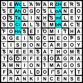 ‘Apart from clue 20’ – that is where we start and the generous clue ‘Prepare for posting by way of “twist” of scene in The Gift of the Magi” gives us FRANK + SCENEIN* = FRANKINCENSE so that we already know where to place some of the paired down clues, so that the lower half of the grid fills speedily.