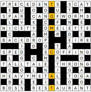 Thanks Bobcat for an enjoyable crossword with my favourites being HEAVY METAL, NON COMPOS MENTIS (nice surface), KID GLOVES, & TORTILLA. I missed EIRE but at least I saw TOMCAT. I agree with Pelham Barton about 28a & indirect anagrams; my understanding is that the fodder be in ‘plain sight’. Thanks Teacow for the blog.