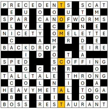 An enjoyable puzzle and the Nina prompted two answers that might have taken a while longer. Thanks for the blog which got to the bottom of a couple of clues where the parsing was beyond me. Loved tortilla, among others.