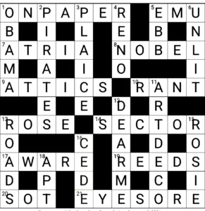 Parsinghidden reversal (withdrawn inside) of chAIR TActfully < – for a word I am not sure we’ve come across before in these crosswords. ATRIUM has a very specific meaning in architecture, a hallway that rises through several levels of a building – but it also means chamber in anatomy – we have two ATRIA in the heart. |
