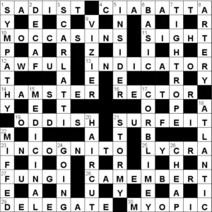 | 1 | SADIST | Who’d love to make you smart? (6) Cryptic Def.: Smart as in a stinging hurt which is the earlier meaning. That is, “stinging hurt” came before the idea of “mentally keen”. That’s the way it was in my school anyway. |