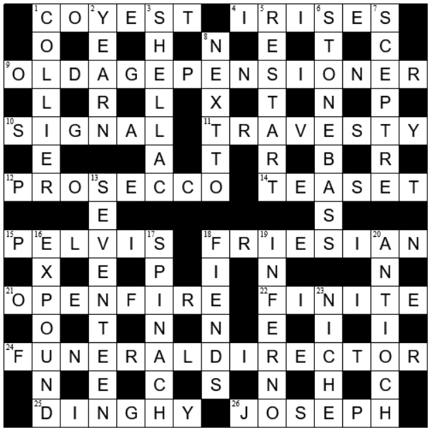 I enjoyed this very much, especially after battling with the last few cryptics. I’m not sure I’ll ever find much pleasure in the cryptics with tortuous and absurd clues. I do like a smooth surface. More from Budmo, please.