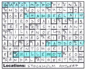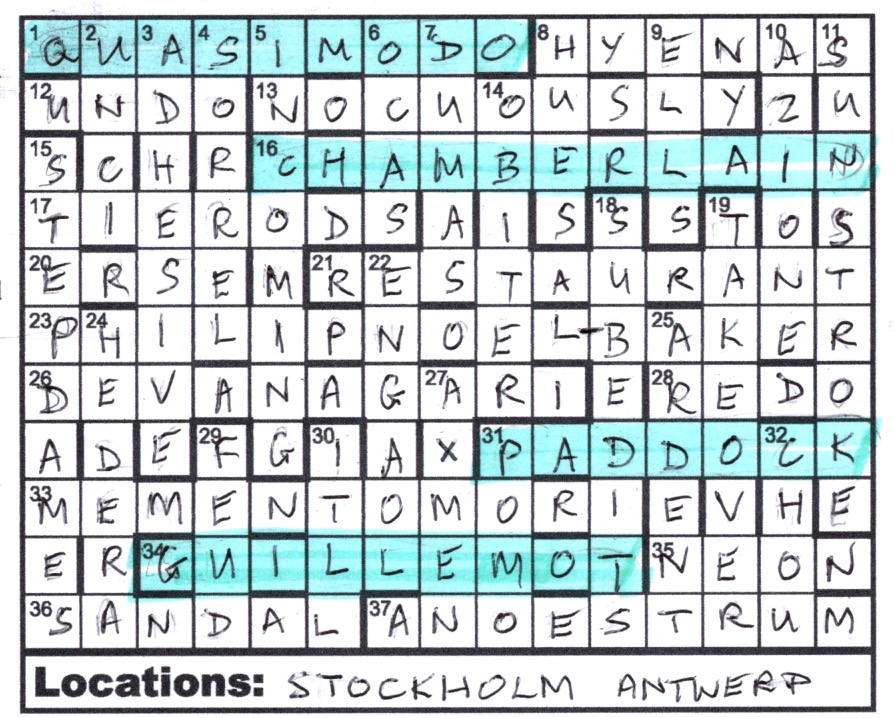 So to the pudding. Google soon led us to PHILIP NOEL-BAKER (the hyphen was needed as a “character” in the indexing so we added it in the grid) who remarkably not only held the government position but won a silver medal in the 1500m at the Antwerp Olympics and received the Nobel Peace Prize – the only person to achieve both of the latter. A bit more Googling led us to QUASIMODO and CHAMBERLAIN as fellow Nobel laureates and PADDOCK and GUILLEMOT as fellow Olympic medallists.