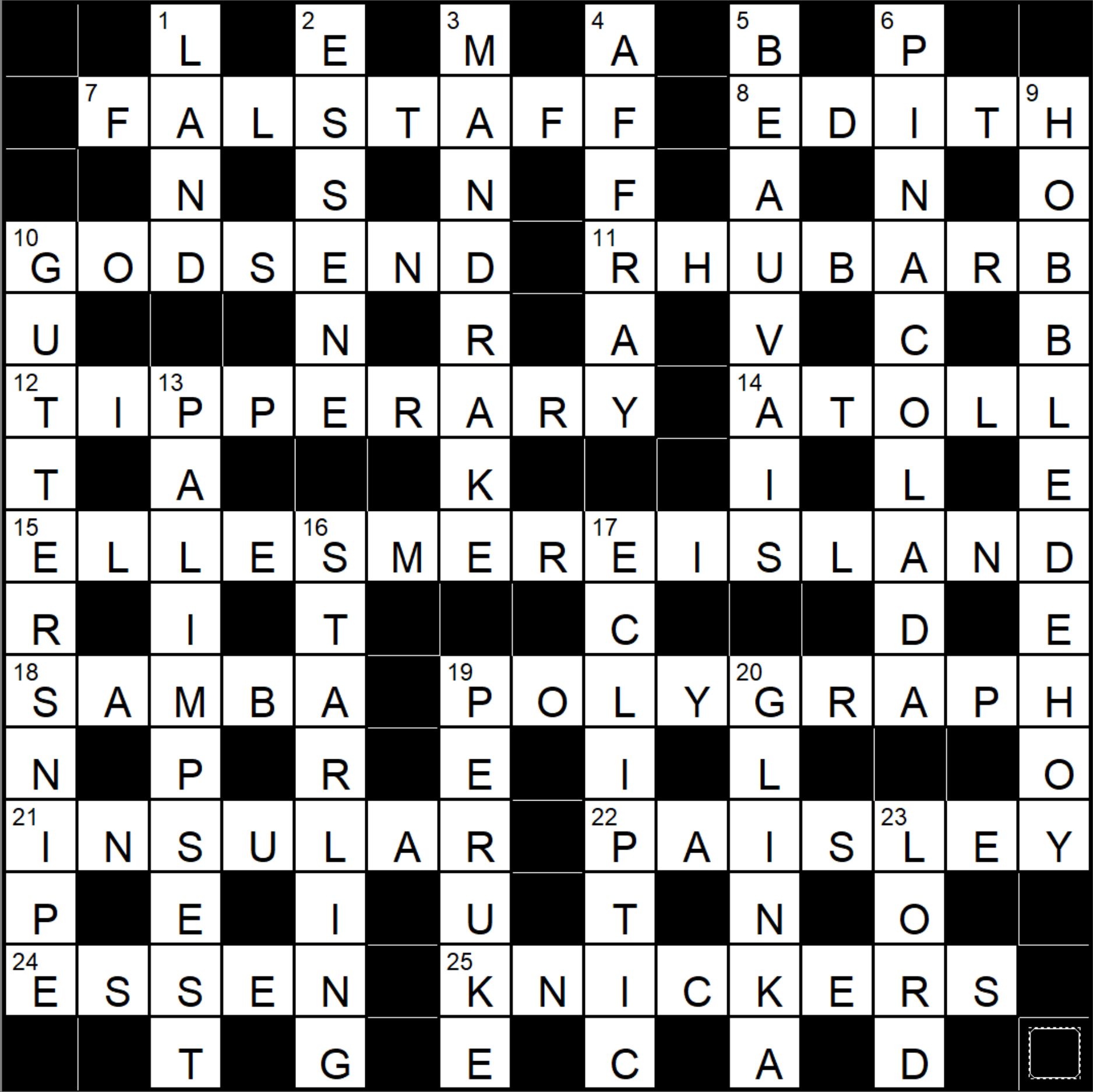 This puzzle had a little bit of geography (4 towns [TIPPERARY, PAISLEY, ESSEN and BEAUVAIS] and an island, [ELLESMERE ISLAND]), but I don’t think that constitutes a theme, even given that all four towns have a cathedral. ATOLL also has a geographic element.