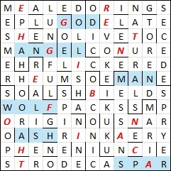 With the passed letters in hand, I solved the remaining clues bar 38a – the only words I could find to fit the grid & the rubric were COSTER becoming CO-STAR, but that was clearly wrong! Anyway, on to the endgame. It wasn’t too difficult to pick out GOD ANGEL MAN WOLF ASH in the even-numbered rows but where was the mineral in the bottom row? Aha – it had to be SPAR and the resolution to 38a was CASPER becoming CASPAR. Phew! What a workout. But worth it.