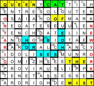 The words from down clues, MUSICAL ABOUT THEIR LIFE TEST SUBJECT needed more investigation. I discovered there is a musical, QUEEN OF THE MIST, about Taylor’s life which accounts for the first part. I could find this nice and easily in the grid, but a further word (3 letters) remained. Naturally I had spotted the CAT in the grid, but didn’t actually consider it for the solution – until something made me take a closer look at this picture on the Wikipedia page. Oh no. Reading further, I saw they sent the poor thing down first to test the barrel. I don’t think I have even been less happy to find a cat in a crossword.