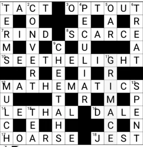 Parsingcharade of SEETHE (be angry) + (with) DAWN (light) – and you often see people talking about penny drop moments or pdm on blogs as that’s the clue that took a while to see. Occasionally it gets expanded to tea tray moment |