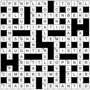 Another challenging but immaculately constructed puzzle from Filbert for our Sunday entertainment. It took me my usual two sittings to complete this one, but I do enjoy tussling with this setter’s offerings.