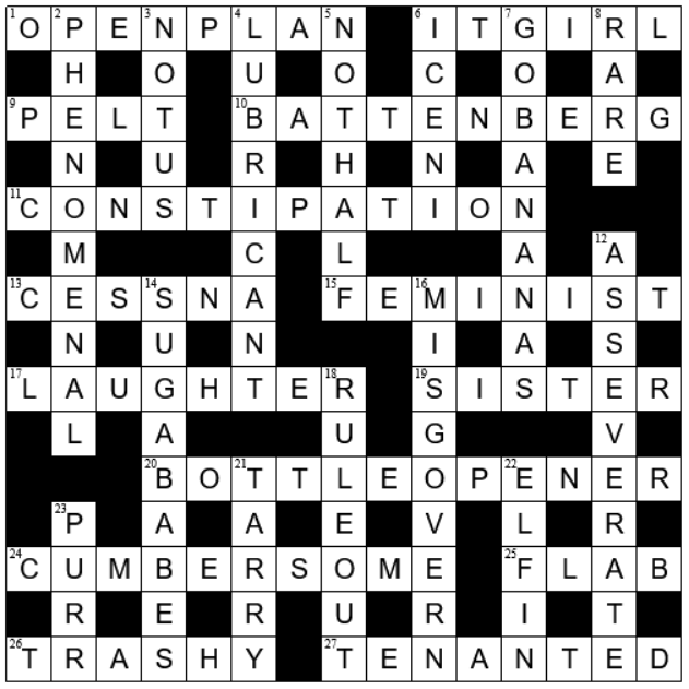 Yes, another elegant and testing puzzle from Filbert with some real twists: an excellent hidden disguising IT GIRL, that misleading def for CONSTIPATION, the neat defs for BOTTLE OPENER and LAUGHTER; the splendid spot of ANEMONE hiding in PHENOMENAL, the delightful surface for SUGABABES and the clever yet simple translation that results in ELFIN.