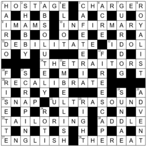 I’m not so far behind you today, Pierre. Thanks for another blog. A very smooth puzzle this morning with some neat surfaces. HOSTAGE, DEBILITATE, RECALIBRATE, TAILORING, HAIRDO, CAFETERIA, EMBELLISH and the nho but beautifully clued FRISETTE are my big ticks today.