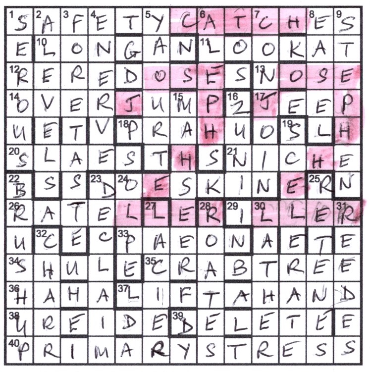 38 clues needed a surplus letter removing before solving. (That left 4 that didn’t at 6, 22, 30 and 32 down, with no special reason for that being so.) The letters spelled out AN ABSURD SITUATION IN WHICH ONE CAN NEVER WIN, which is part of Chambers’ definition of Catch-22, from the title of Joseph Heller’s well-known novel. And CATCH in the top row together with JOSEPH HELLER snaking neatly below it twice in the shape of 22 gave the required highlighting to finish the puzzle.