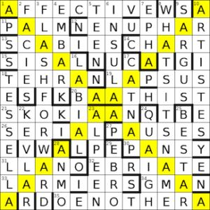 I guessed that the As would occupy both diagonals early enough for it to be helpful, but I still found the puzzle a little tricky and I ended up hunting in Chambers for the last few answers. I didn’t have a hope of working out SKOKIAAN since I didn’t know that word or KOKA, but I might have worked out NENUPHAR if I had thought of ‘sport’ being RU. I also couldn’t think of the second letter of OENOTHERA and I often have trouble with clues where a short word like ‘off’ indicates a phrase NOT HERE. I managed to guess QUIAGH despite the only part of the clue I understood being ‘queen’ is QU, and even then it might have been Q but I thought R was less likely.