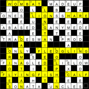 I also share his appreciation for this new setter. I especially liked the theatrical clue at 10a LION’S SHARE, the bird-talking doctor at 8d LONG-TAILED TIT, and the unflappable lovers at 16d ORIOLES. And there were many other interesting stories told in the excellent surfaces throughout this puzzle. I look forward to more from Pavo.