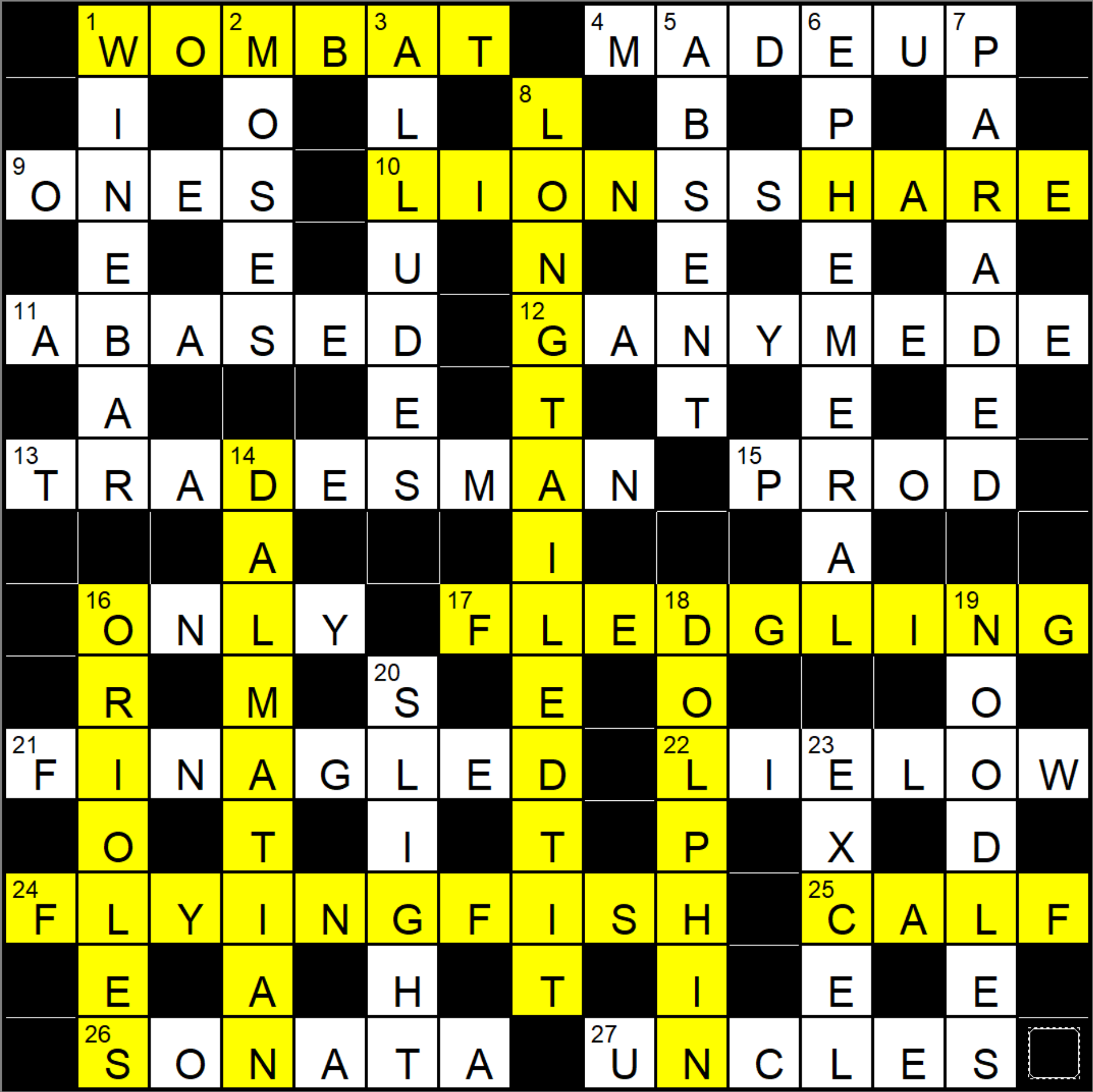 Last couple in were “flying fish” (offish…hmm…”stand-offish” is familiar) and “finagled” as, fortunately, all the creatures were familiar.