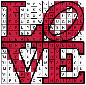 Very appropriate for 14th February, and what an amazing feat by Cranberry to fill a 14 x 14 barred grid with mirror symmetry with only a few unusual words and the restriction of only being able to use the nine letters in the artist’s name in 106 of the 196 cells.