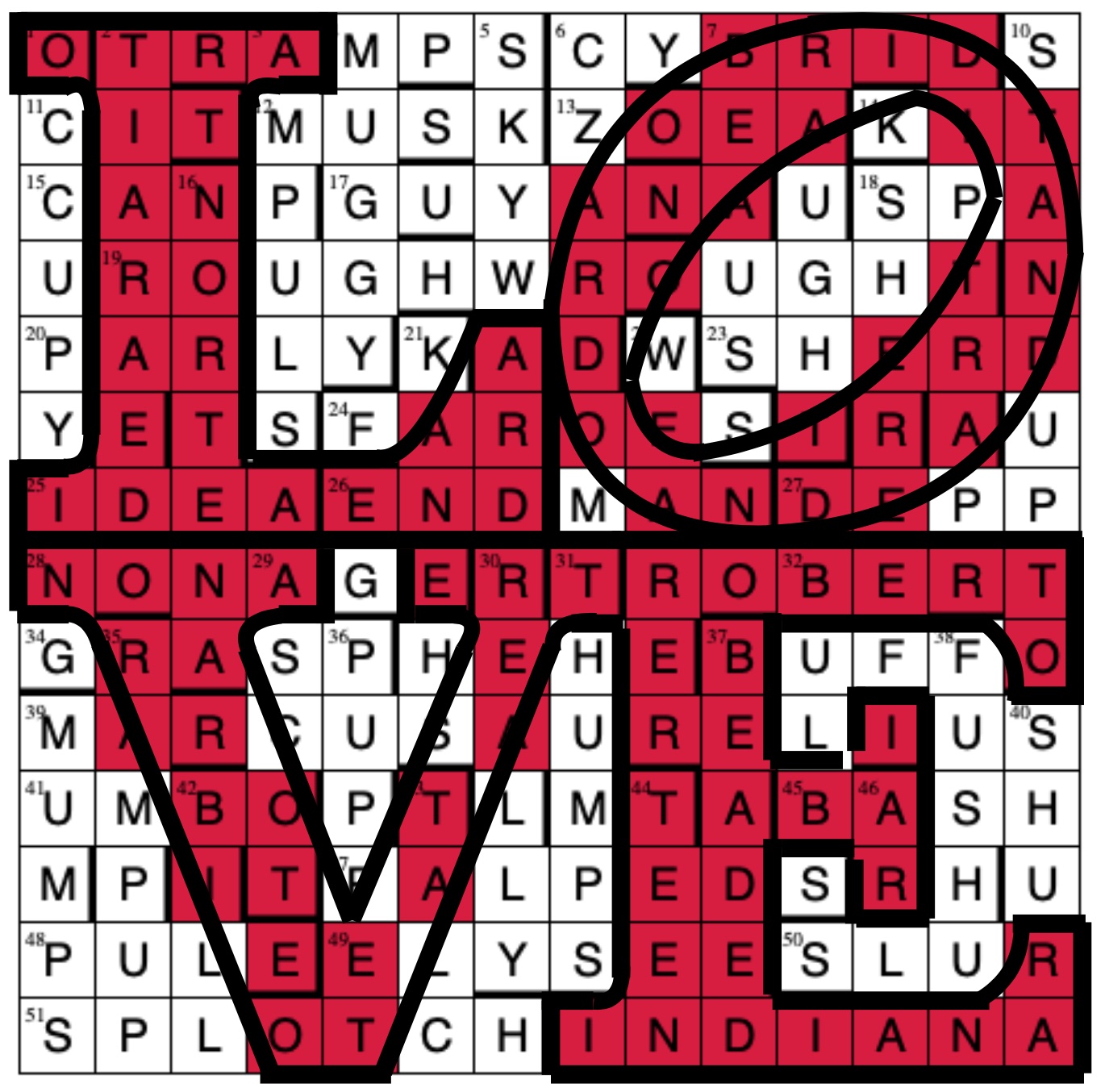 Very appropriate for 14th February, and what an amazing feat by Cranberry to fill a 14 x 14 barred grid with mirror symmetry with only a few unusual words and the restriction of only being able to use the nine letters in the artist’s name in 106 of the 196 cells.